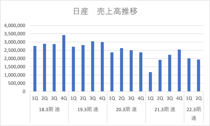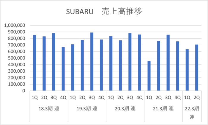 一方、日産とSUBARUについてはもともと四半期ベースでの売上高のブレが大きいことから、どの程度持ち直しているのかがわかりづらい状況となっています。日産についてはコロナ禍前から緩やかに減収が続いていたこともあって、ある程度の持ち直しは見えつつも従来からの減収トレンドが継続しているように見えます。