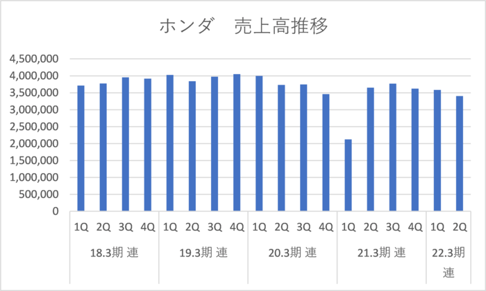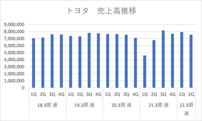 こうして見ると、2021年3月期1Qに売上高が大きく落ち込んだのは4社共通ですが、トヨタとホンダについてはその後すぐ持ち直し、コロナ禍前の水準を安定して取り戻しています。とりわけ、トヨタに至っては若干ではありますがコロナ禍前よりも売上高が増えていますね。