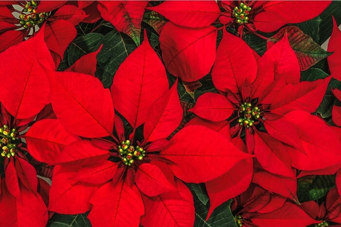 ポインセチアの赤い部分は花や葉と思われがちですが、じつは苞(ほう)と呼ばれる花を保護する葉のようなもの。実際の花は苞の中心に作られた黄色の部分です。