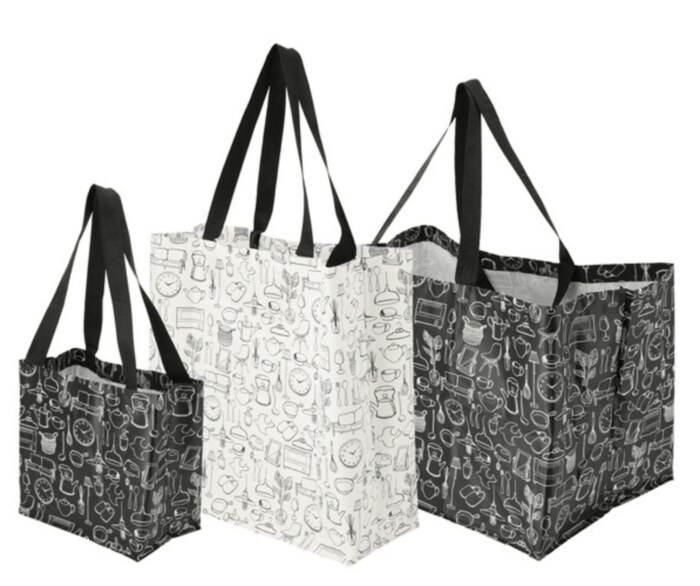 またこちらの商品には、同じブラックでSサイズのエコバッグ(縦26×幅27×奥行16cm/税込79円)、ホワイトのMサイズ(縦45×幅45×奥行18cm/149円)もあります。お買い物内容や荷物の量に合わせて、3種類を使い分けてもよさそうですね。