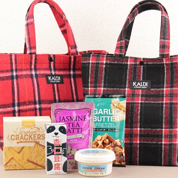 ツイード生地のチェックがかわいいこちらのバッグ。中にはカルディ人気の「パンダ杏仁豆腐 ミニ」をはじめ、おやつやおつまみとしても楽しめる「ガーリックバタープレッツェル」や「グラハムクラッカー」など、バッグ限定商品を含んだ全5アイテムが入っています。