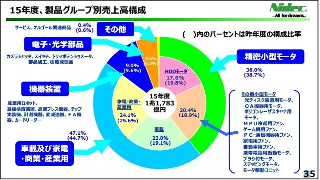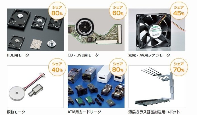 ここから明らかなように、売上高の約95%はモータ関連であり、残りは産業用ロボット、基板検査装置などの機器装置やカメラシャッタなどの電子光学部品となっています。