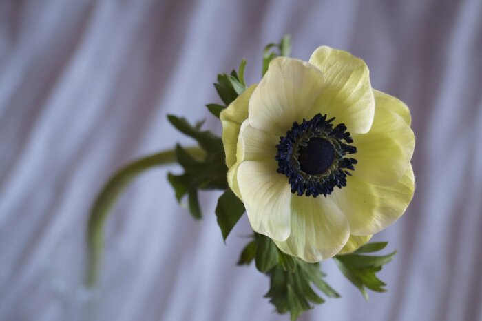 花びらのビビッドカラーに対して花芯は濃い紫や黒っぽい色です。シンプルな1輪挿しにすると、アネモネの個性が光る飾り方になります。