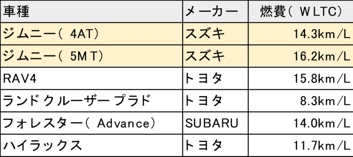 そこで、次に他の4WDオフロード車と燃費を比較してみましょう。(図表を参照)
