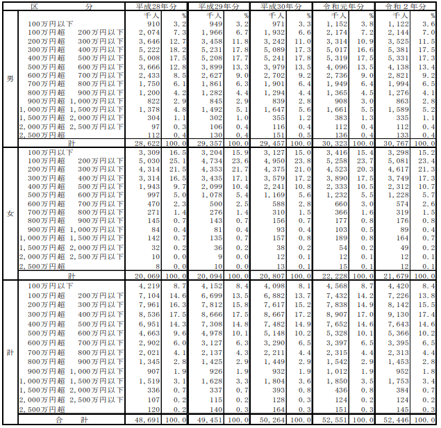男性で年収1000万円超~2000万円以下は男性全体の6.3%、女性の場合には女性全体の0.9%ということがわかります。