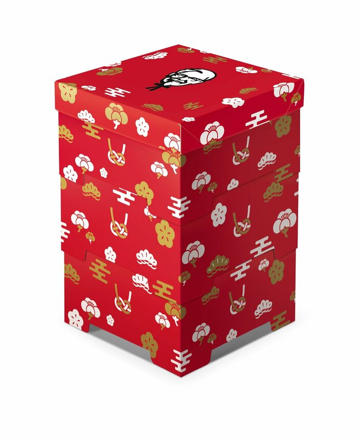 セットはボリュームの異なる「松・竹・梅」の3種類がラインナップしているので、人数に合わせて選ぶことができます。また、ふたには笑顔のカーネル・サンダース、箱には縁起の良い和柄をちりばめた華やかなお重のパッケージも、お正月気分をさらに盛り上げてくれそうです。