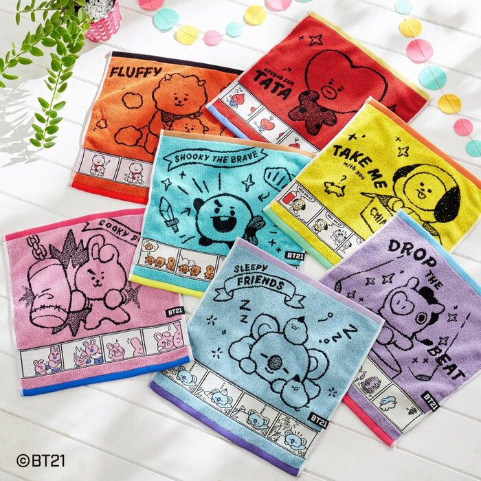 やや大きめのハンドタオルと、ポケットなどにしまいやすいハンカチタオル。4コマ漫画風のイラストがかわいらしい商品です。それぞれキャラクターが描かれた各7種のラインナップで、毎日推しのアイテムを持ち歩くことができますよ。