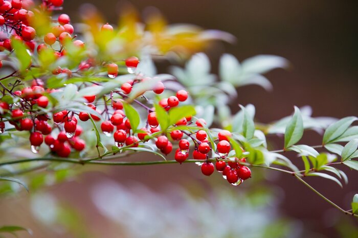 「難を転じる」という言葉に由来した名前を持つナンテン。花言葉は「よき家庭」「福をなす」「私の愛は増すばかり」「機知に富む」です。江戸時代の頃から厄除けの木ということで庭に植えられてきました。