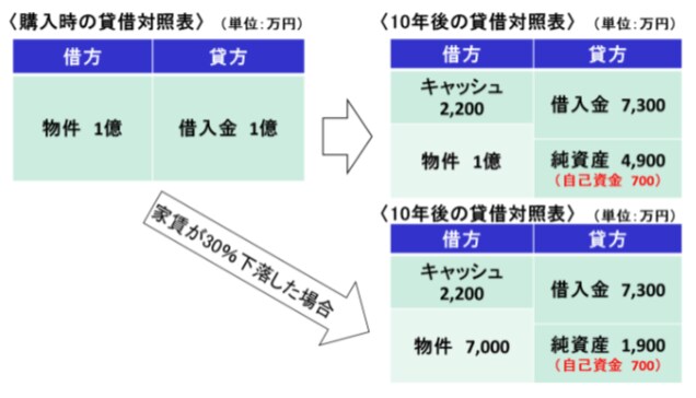 購入当初は、物件と借入金がそれぞれ1億円という状態です。10年後に購入時の1億円(売却利回り10%)で売却できたとします。