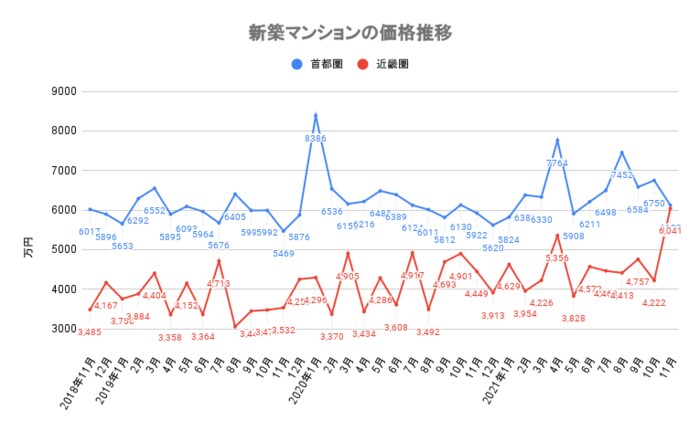 2021年10月には首都圏新築マンションの平均価格が6750万円となり、ハブル期を越え、10月として過去最高となりました。近畿圏でも、同年11月の平均価格がバブル期以来の高値を記録しています。