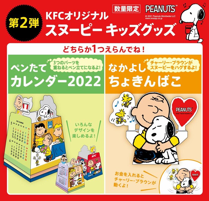 ケンタッキーでは、お子さんたちが楽しめる「キッズメニュー」を販売しています。2021年12月27日(月)から始まるスヌーピーグッズは2種類どちらも、新年を迎えるこの季節にピッタリなアイテムです。今回登場するのは「ペンたてカレンダー2022」と「なかよしちょきんばこ」。どちらもケンタッキーオリジナルデザインとなっています。