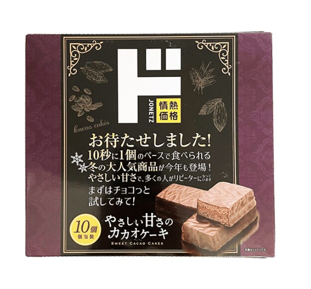 中には個包装された小さなチョコレートケーキが、10個入っています。チョコレートでコーティングされたスポンジの中にも、チョコクリームが。まさにチョコレートづくしのケーキです。しっとりとしたミニケーキは、パッケージにあるとおり10秒に1個食べられるほどのおいしさです。おやつはもちろん、ちょっと小腹が空いたときなどにもおすすめです。