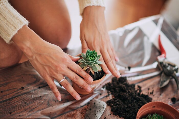 大きめの多肉から植えていくと、バランス良くまとまります。微妙に空いた隙間などには、セダムなどを植え込んでもよいでしょう。