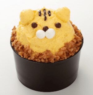 いシリアルチョコとココアビスケットに濃厚なチョコクリームを重ね、その上にバナナソースが入ったバナナクリームをのせました。仕上げにとらの顔をチョコやクリームで飾り付けした、お子さんたちにぴったりな商品です。