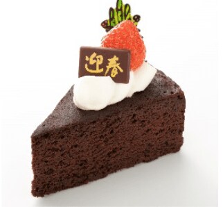 クラシックショコラです。口溶けの良いホイップクリームを絞り、クラシックショコラとよく合う甘酸っぱい苺を乗せ、華やかに仕上げています。「迎春」プレートがお正月らしさをアップしてくれます。