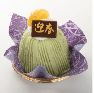 濃厚な味わいの宇治抹茶と自家炊き粒餡を味わう、和洋折衷のスイーツです。クッキーの上に、黒蜜きな粉粒餡と栗甘露煮を入れた宇治抹茶ムースを乗せ、宇治抹茶ホワイトチョコクリームを絞り、お正月らしく栗甘露煮とチョコプレートを飾っています。「迎春」の文字がお正月らしさをアップしてくれます。