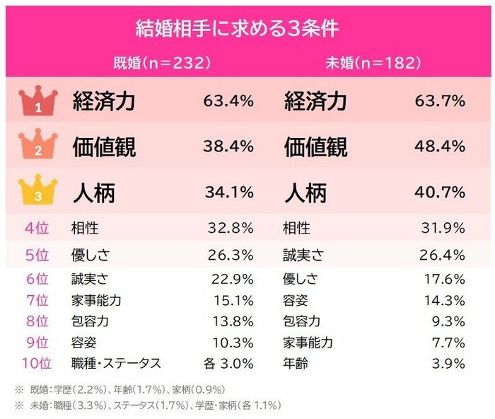 未婚・既婚ともに女性が結婚相手に求める3条件は「経済力・価値観・人柄」と共通しています。