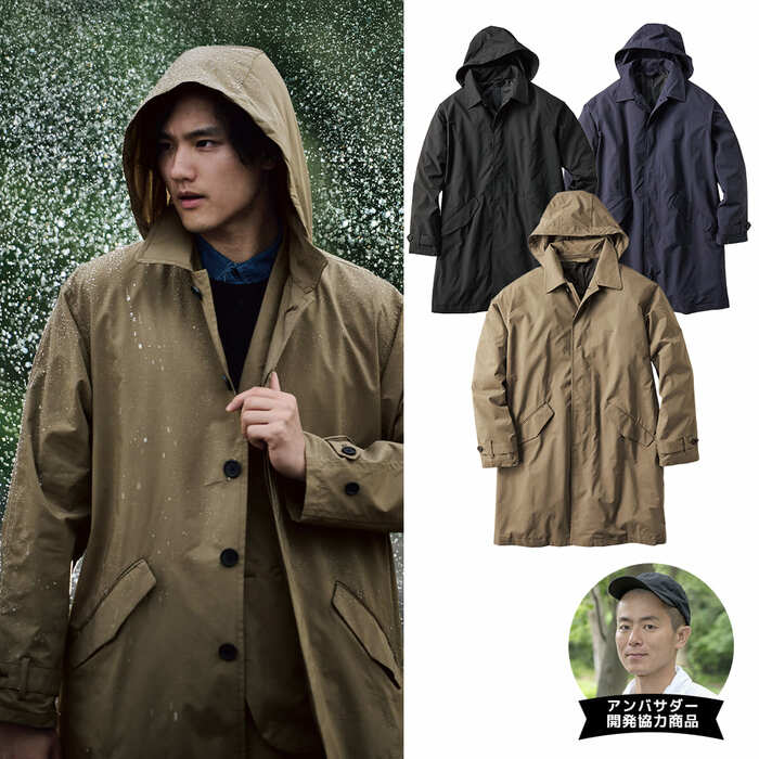 やわらかい肌ざわりのステンカラーコート。耐久撥水・UVカット・防汚機能などが備わっているそうです。また、高機能繊維を採用しているため、吸収した赤外線を熱に変え蓄えてくれます。iPadが入るサイズの内ポケットがあったり、小さくたたんで持ち運んだりできるのでビジネスシーンでも大活躍。