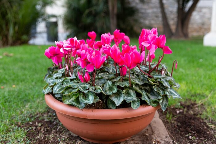 一般的なシクラメンよりやや小ぶりの花が咲き、冬の屋外でも植えられるガーデンシクラメン。球根から次々と花芽が伸びて春先までかわいい花が咲き続けます。