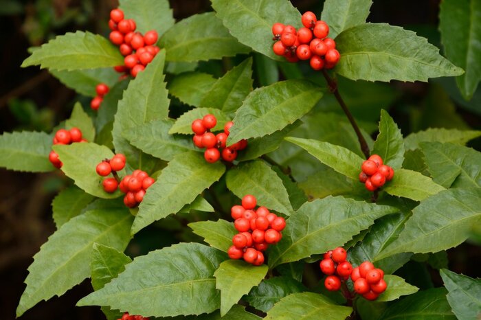 縁起のよい切り花として、お正月に飾られる千両。緑葉に赤い実がたくさんついている千両は一本で飾ってもおめでたい雰囲気になる切り花です。松などと一緒に生けるといっそうお正月の雰囲気が高まります。