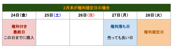 - 権利付き最終日:権利確定日の2営業日前!(この日までに株式を保有している必要があります)