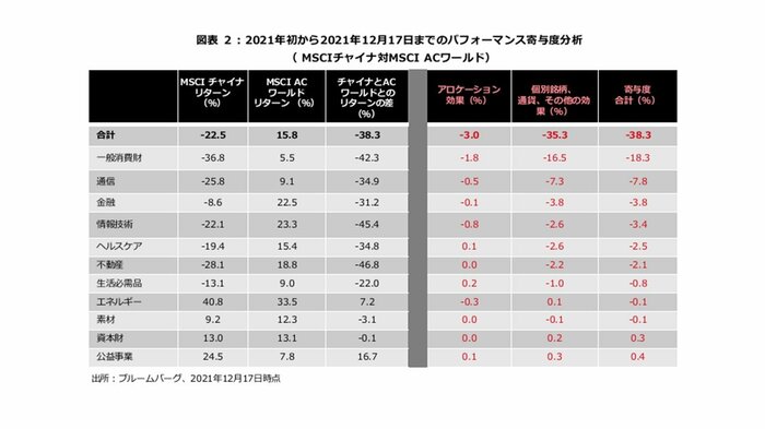 個別銘柄レベルでの寄与度を集計することで、新たな規制が中国株式の相対的なパフォーマンスに与える影響をある程度推定できよう。
