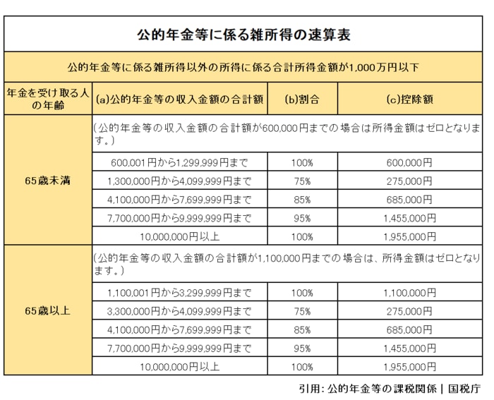 ※年金以外の所得が1000万円を超える場合は、別の計算式となりますので、国税庁のHPを参照してください。