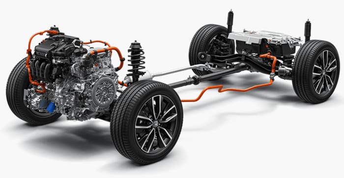 駆動用モーターと発電用モーターの2つのモーターを備えており、発進や街乗りではバッテリーからの電気を使用してモーターで走行し、力強い加速が必要な場合はエンジンが発電用モーターを回して電気を作り駆動用モーターを回し、高速道路などでは、バッテリーの充電状況に応じてエンジンで走行を行います。