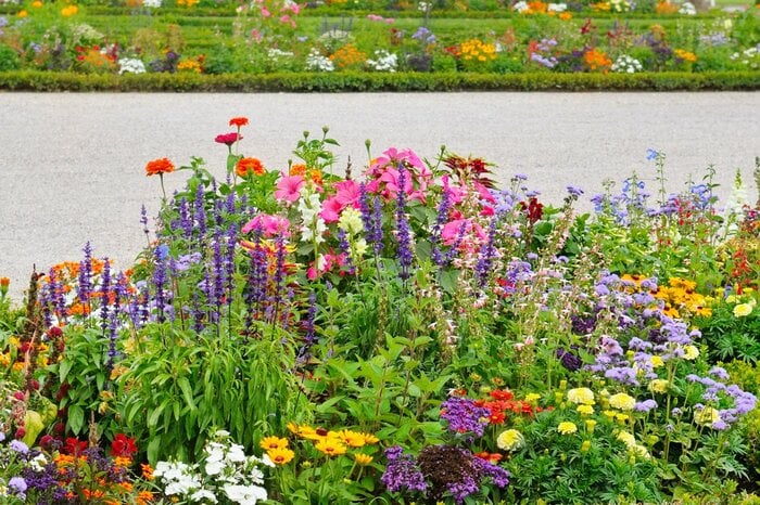 多年草が咲き終わってしまったら、その時期に咲いている一年草をすき間に植え込むと華やかさがアップ。広い花壇であれば庭にシンボルツリーを1本植えるのもよいでしょう。