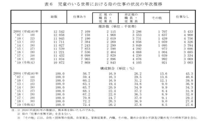 まずは厚生労働省の「2019年国民生活基礎調査の概況」より、子どもがいる世帯の女性の仕事状況を確認しましょう。