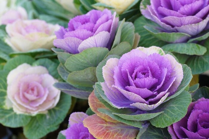 ハボタンは美しい状態を長く楽しめるため、寄せ植えにも適しています。ビオラやパンジーなどとも相性がいいですよ。