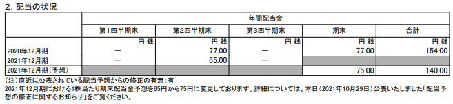 2020年12月期と比較すると減配となっていますが、2021年10月29日に配当予想の引き上げを発表しています。