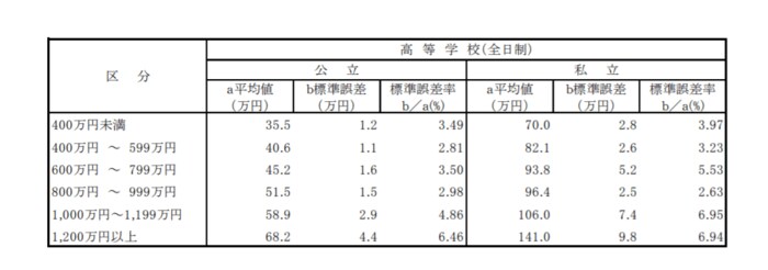 年間収入が400万円未満の世帯では、小学校では公立約23.6万円、私立約116.8万円。中学校では公立約38.8万円、私立約110.3万円。高等学校(全日制)では公立約35.5万円、私立約70.0万円です。