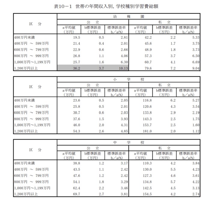 同調査より、世帯の年収別にそれぞれにかける教育費用の平均を見ていきます。
