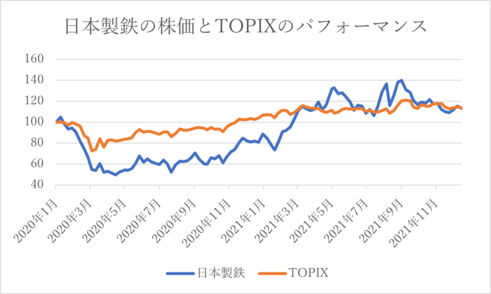 こうして見ると、日本製鉄の株価パフォーマンスはコロナ禍において2021年2月頃までTOPIXを下回ってきました。