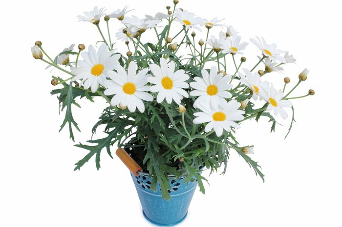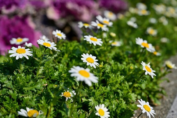 マーガレットは真っ白な花びらをつける一重咲きのものがポピュラー。品種改良によって八重咲きやポンポン咲きもあり、ピンクや黄色、紫など花色もバリエーション豊富になりました。