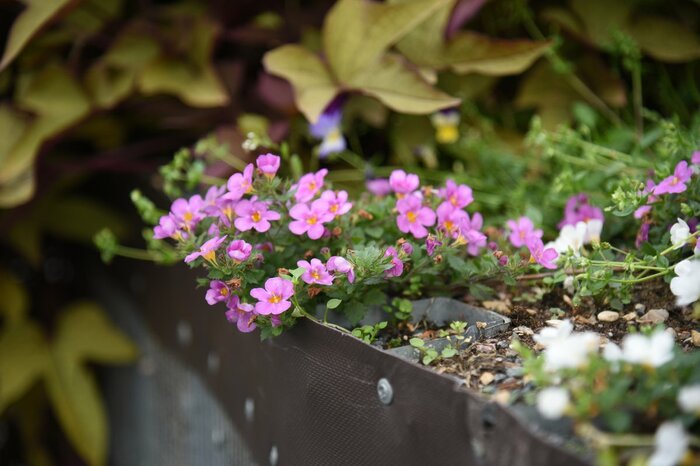 バコパは春~秋にかけて、長い間咲き続けます。小さな星形の花が可憐で、色は白やピンク、紫、青など淡い色合いです。草丈は5~15センチで、細い茎を枝分かれさせながらほふくして生長します。