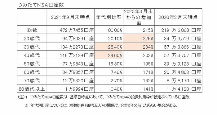 そのうち、つみたてNISAの口座数は約472.7万口座。2018年1月から始まってまだ4年ほどですが、将来に備えて資産運用を始めている人は年々増加しており、特に20~40代で増えています。