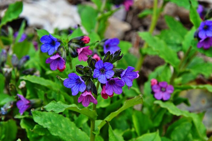 開花が進むにつれて花色がピンクから青色に変わる姿がかわいらしい、人気上昇中のプルモナリア。葉に斑が入る品種が多く、カラーリーフとしても重宝する草花です。