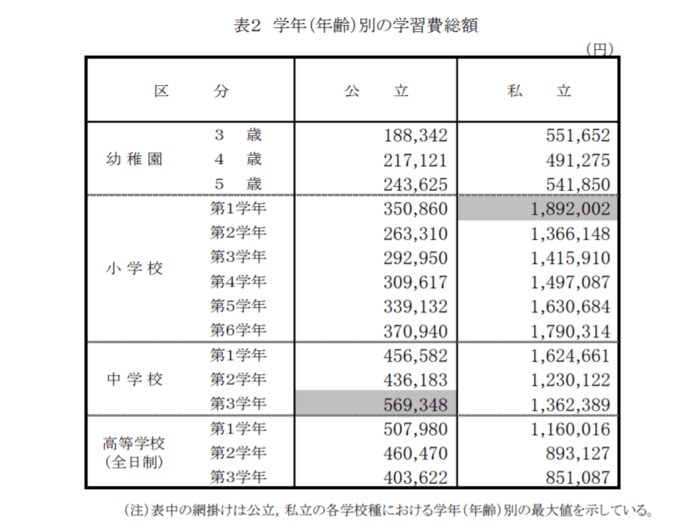 下記は幼稚園~高校までの、公立と私立に分けた学年別の学習費総額です。