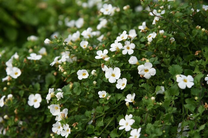 地面を這うように横に広がり、一面に白や青、ピンクの小花を散りばめたように咲くバコパ。