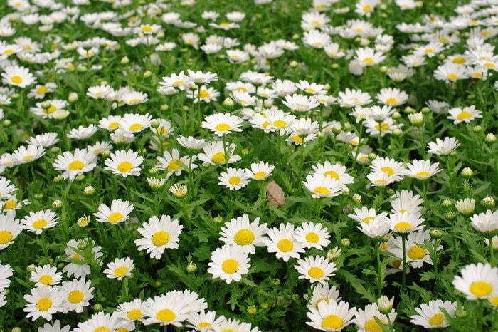白い小花が冬から春までの長い期間咲く、キク科のノースポール。とても強い性質で、地植えにするとほとんど水やりしなくても元気に育ちます。