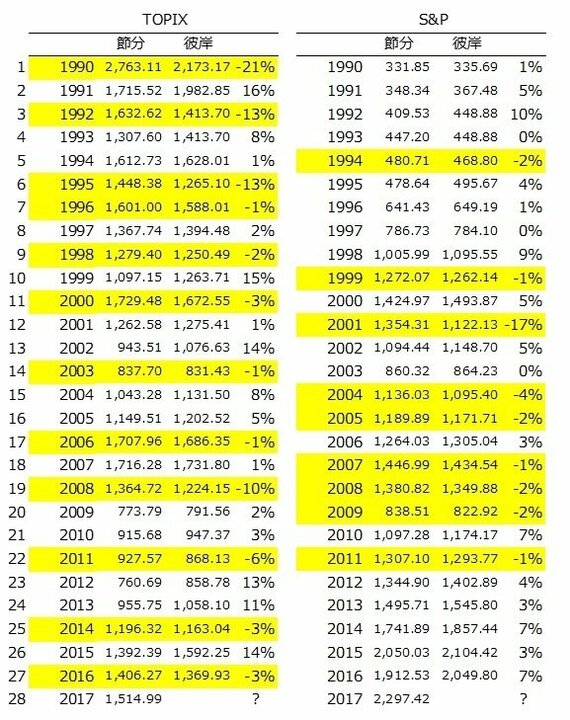 「節分天井・彼岸底」をTOPIXとS&Pで検証