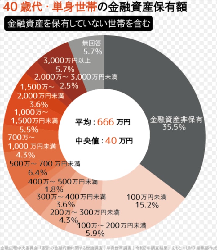 中央値は40万円ですが、その分布はさまざまです。最も多いのは金融資産非保有で35.5%。100万円未満を含めると、およそ半数が貯蓄100万円未満です。
