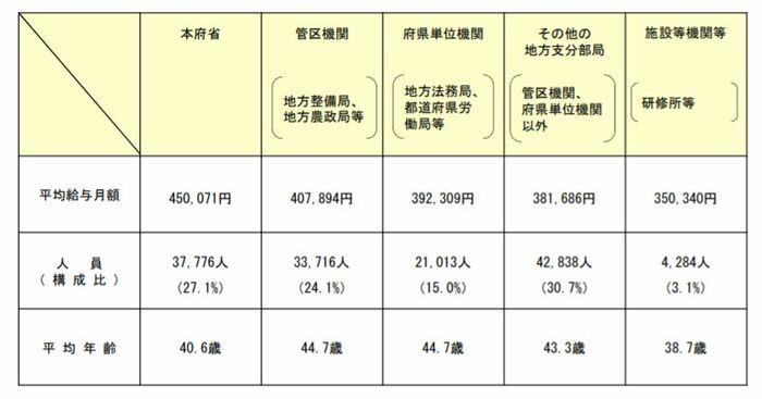 ※平均給与月額は、俸給と諸手当(地域手当、広域移動手当、俸給の特別調整額、本府省業務調整手当、扶養手当、住居手当、単身赴任手当(基礎額)、寒冷地手当、特地勤務手当等)の合計額です。ただし、特殊勤務手当や通勤手当、超過勤務手当などの実費弁償的または実績支給である給与は含みません