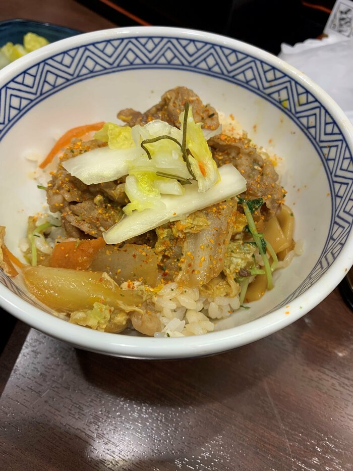 すき焼き丼にした段階で、食感は全体的に柔らかめ。ここで、だいじに残しておいたお新香にご登場いただきます。最後に、歯応えとさっぱり感を味わいましょう。