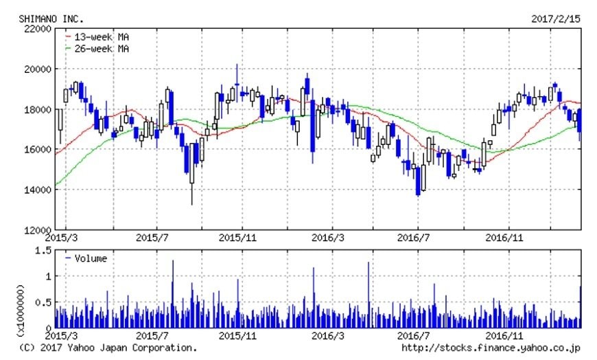 決算発表の翌日、シマノの株価は急落となりました。一時は前日比▲7%超下落する場面が見られ、その後やや戻したものの、終値も同▲4.4%安で引けています。久々の大幅下落となりましたが、業績回復が鈍いことへの懸念が出た可能性があります。