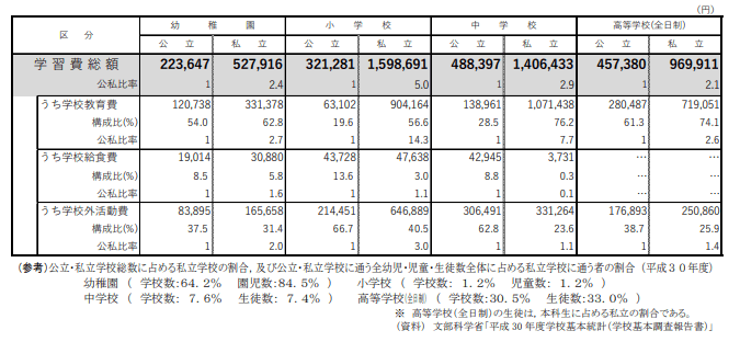 しかし、直近のデータである平成30年度の結果をみると一概に「公立は安い」とはいかないことが分かっています。