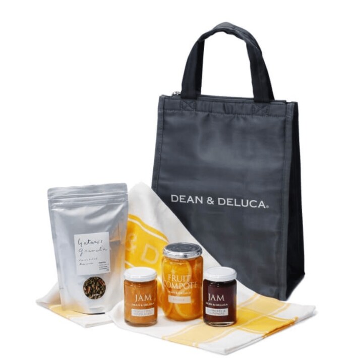 ・セット内容:抹茶グラノーラ(Yataros)、ラズベリーシャンパン ジャム(DEAN & DELUCA)、トリプルシトラスマーマレード ジャム (DEAN & DELUCA)、フルーツコンポート オレンジ S(DEAN & DELUCA)、ティータオル イエロー(DEAN & DELUCA)、クーラーバッグ グレーM(DEAN & DELUCA)