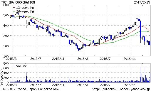 決算延期という異例の事態が明らかになった翌日、2017年2月15日の東芝(6502)の株価は前日比▲9%安と大幅安で引けました。2016年12月末に米原子力事業の巨額減損リスクを突如公表した時から比べると、株価は半分以下に下落、時価総額も約1兆円強が失われています。